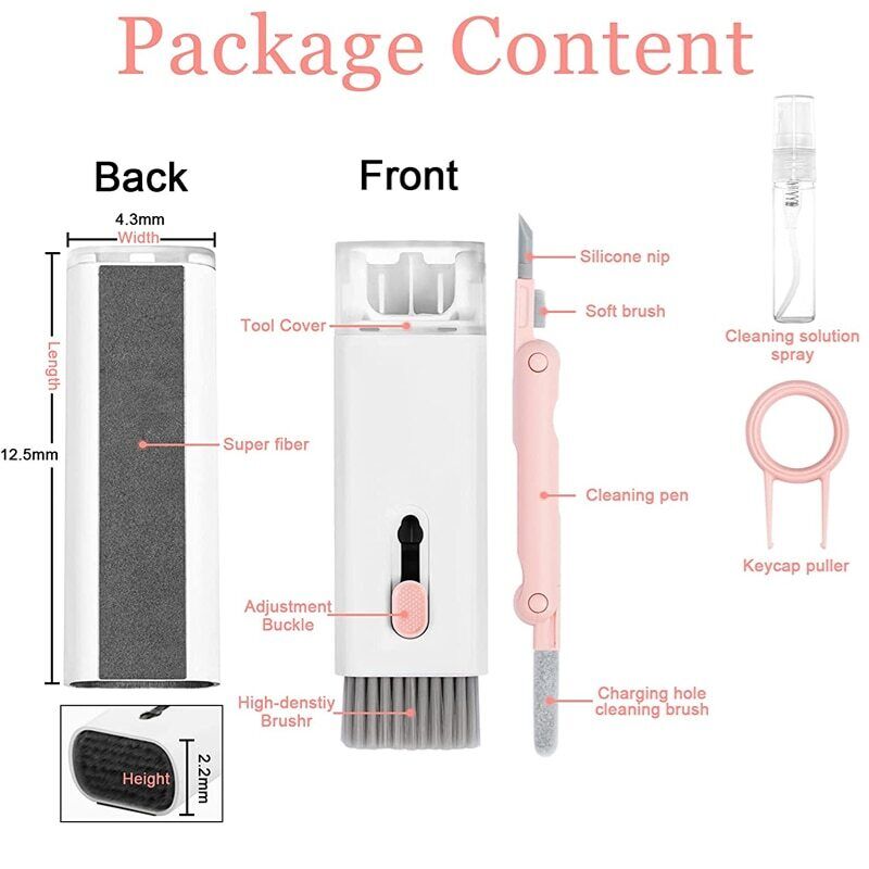 2. Powerful Function: The silicone tip is used to remove stubborn stains in the crevices of earphones, buttons, and other items. High-density brushes are used to remove dirt and dust from the sound holes of the earphones. The flocking sponge is used to remove dust from the inside of the earphone charging case. Flannel wipes are used to clean large dusty areas such as keyboards, desks, window rails, etc.